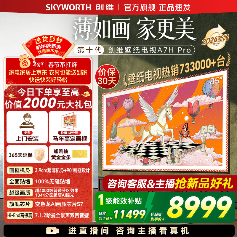 创维壁纸电视85A7H Pro 26年新品国家补贴MiniLED 85吋艺术电视A7FPro升级款 无缝贴墙 【免费安装】 85英寸