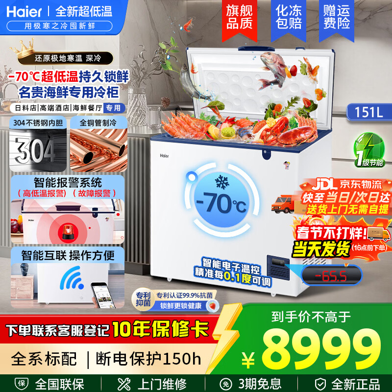 海尔(Haier)超低温冰柜零下负-70/-65/-60℃度商用家用大容量卧式冷冻柜金枪鱼海鲜柜一级能效以旧换新 零下70度|不锈钢内胆|全铜管|手机互联 151L