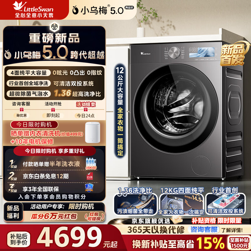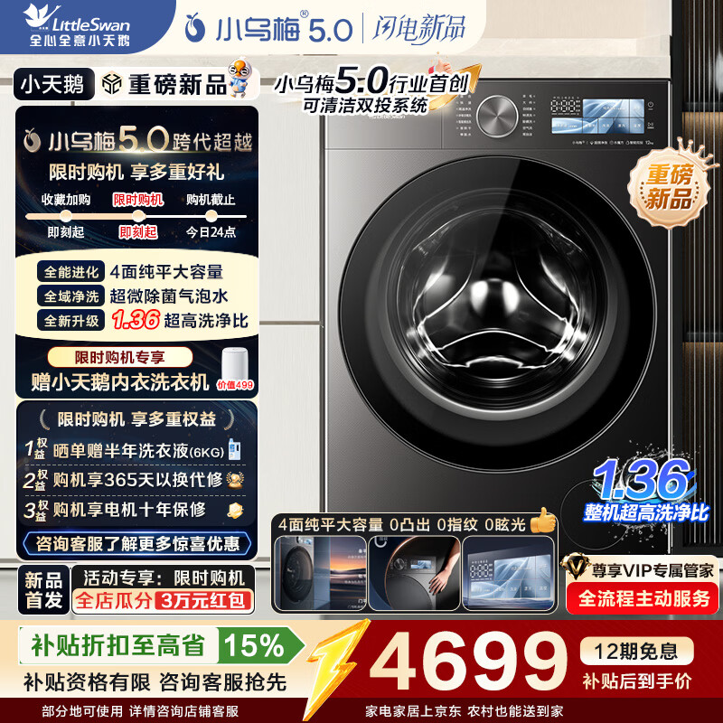 小天鹅(LittleSwan)小乌梅5.0高奢版 AWE同款 滚筒洗衣机全自动 12KG纯平大容量 真1.36洗净比超微除菌气泡水以旧换新 【重磅新品】TG12EK60 滚筒