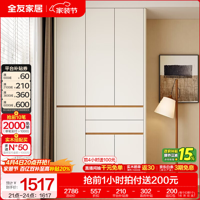 全友家居原木风成品衣柜收纳储物衣橱柜子卧室家用顶天立地大衣柜组合 【1.27*2.4m】加高三门衣柜