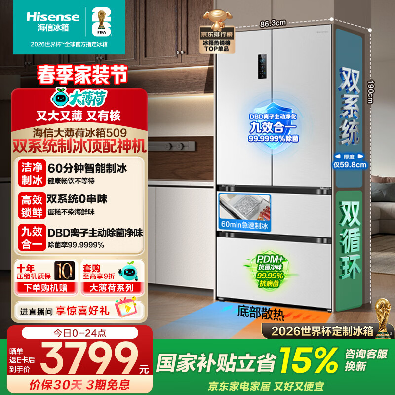 海信(Hisense)大薄荷509L法式多门冰箱双系统自动制冰嵌入大容量白色世界杯定制冰箱BCD-509S3FZSQD