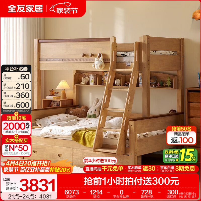 全友家居儿童上下铺双人床全实木双层高低床带护栏男孩女孩储物收纳床 上下床+书架+底抽+床垫 1.2米x1.9米