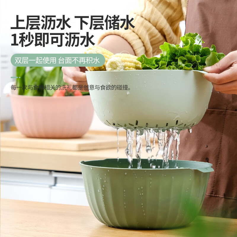 翰鸥斐双层沥水篮洗菜篮家用厨房装蔬菜水果盘洗水果滤水篮 【中号】两件套