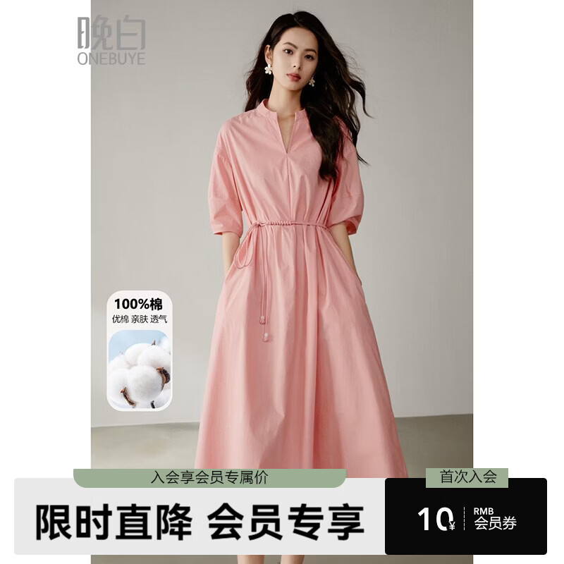 晚白【新品】2026年春款V型立领全棉裙子系带收腰宽松遮肉大码连衣裙 粉色 XL