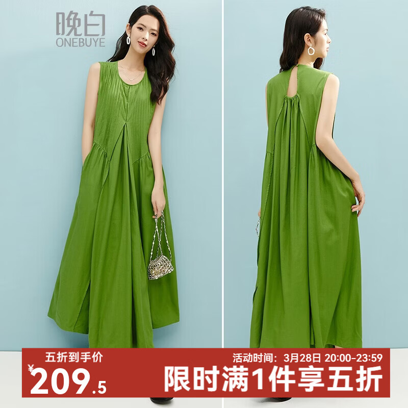 晚白2026年春夏款时尚简约圆领棉麻裙子休闲宽松大摆无袖连衣裙 绿色 S