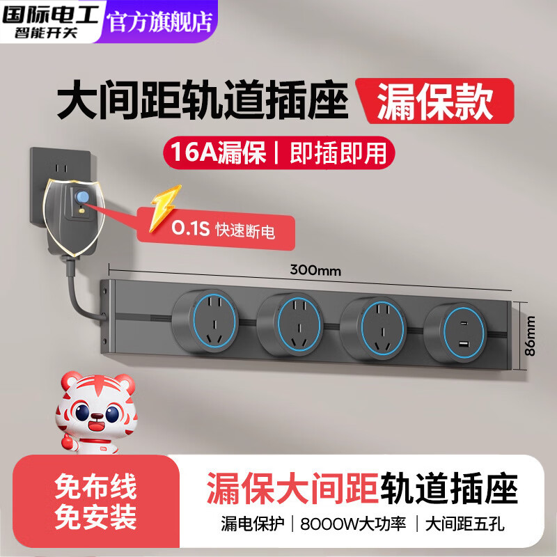 国际电工漏电保护轨道插座餐边柜带线厨房10a插头防触电保护电源16a防漏电 16A漏保带1.5米线【大间距五孔】浅灰 50CM轨道+3个大五孔蓝灯+USB/Type-C