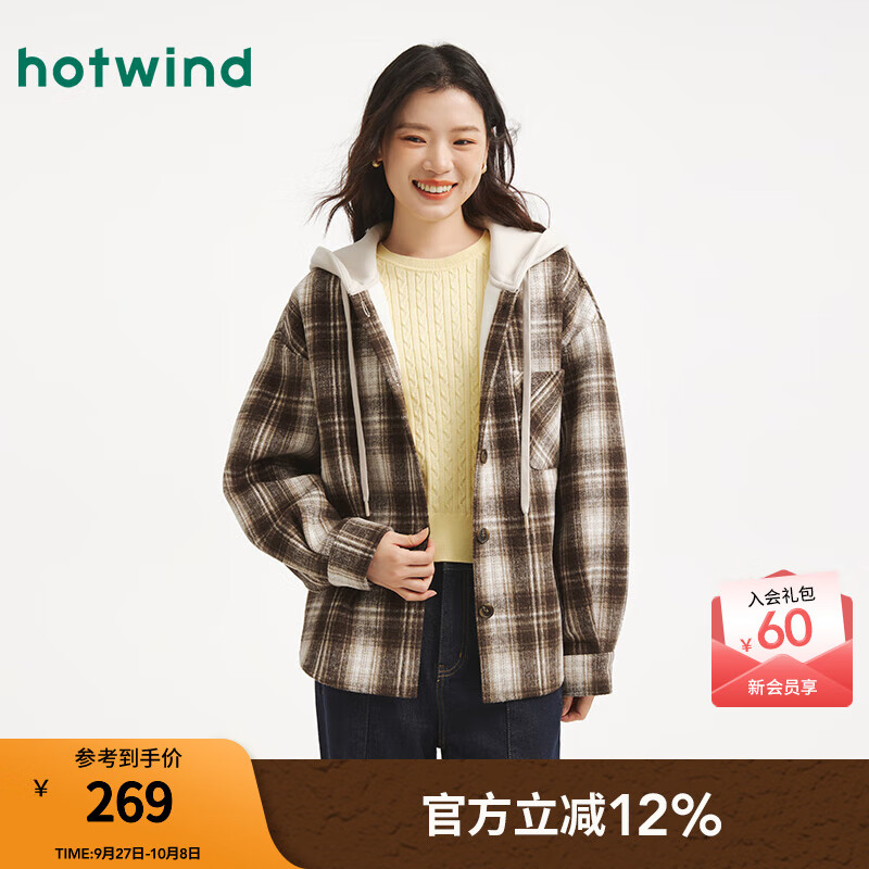 热风(Hotwind)女士格纹夹克外套上衣2025年冬季新款宽松连帽轻薄格子外套 02棕色 M