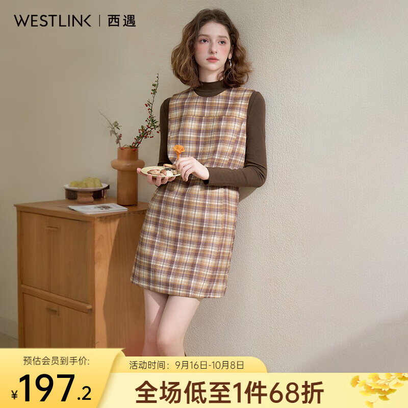 西遇(Westlink)复古黄色格纹背心裙女秋季宽松直筒显瘦无袖连衣裙短裙 咖色 S (155)