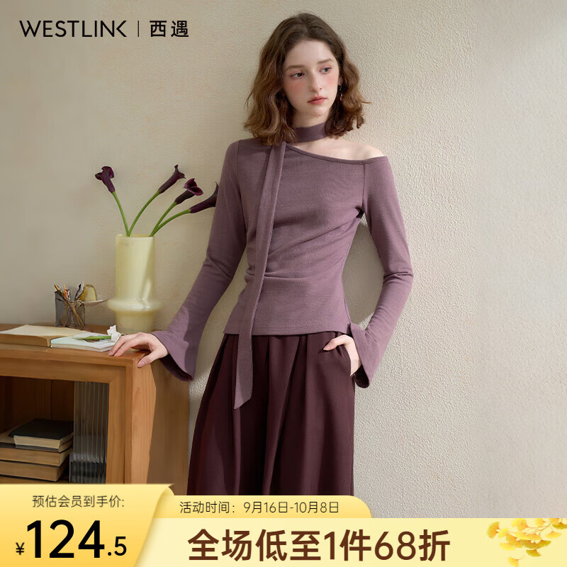 西遇法式飘带斜肩抽褶显瘦纯色T恤女2025秋季新款设计感气质上衣 紫色 (XL预售10月13) M (160)