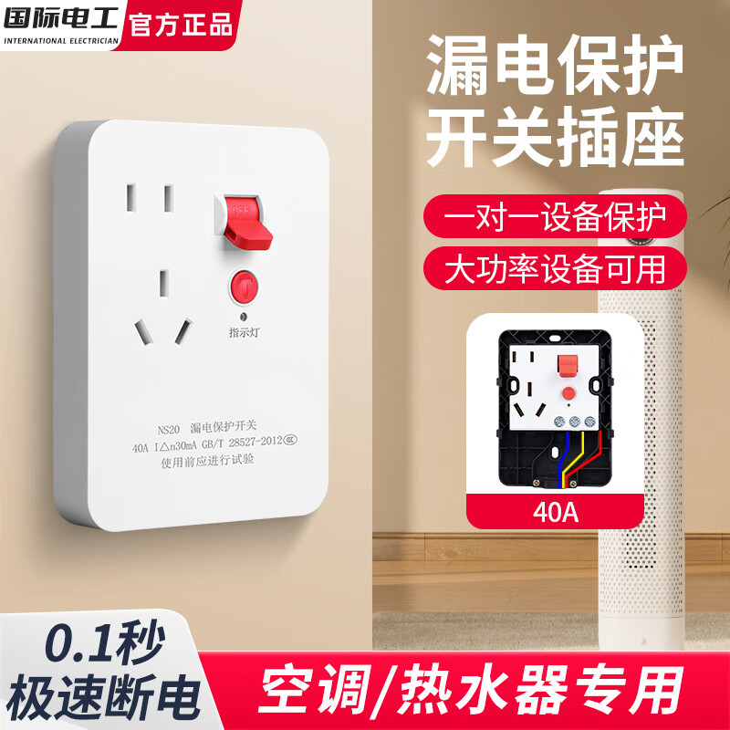 国际电工五孔漏电保护插座插头40A大功率空调电热水器漏保专用保护器开关 白色-五孔漏电保护开关【40A】