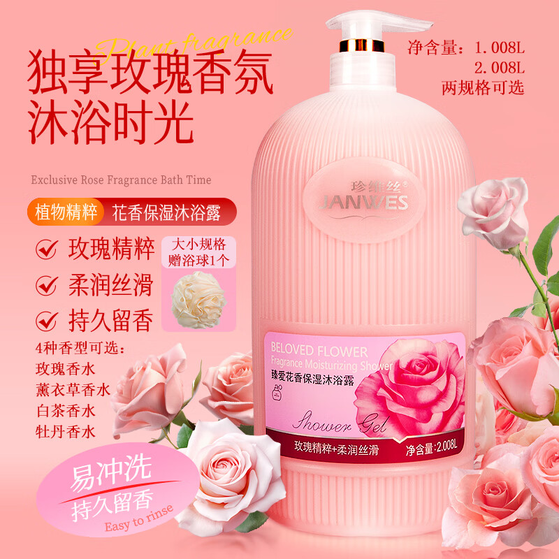 珍维丝香水沐浴露持久柔顺精粹润肤大容量柔润香氛美肌沐浴乳水润 玫瑰香水沐浴露 2008ML(4斤装)