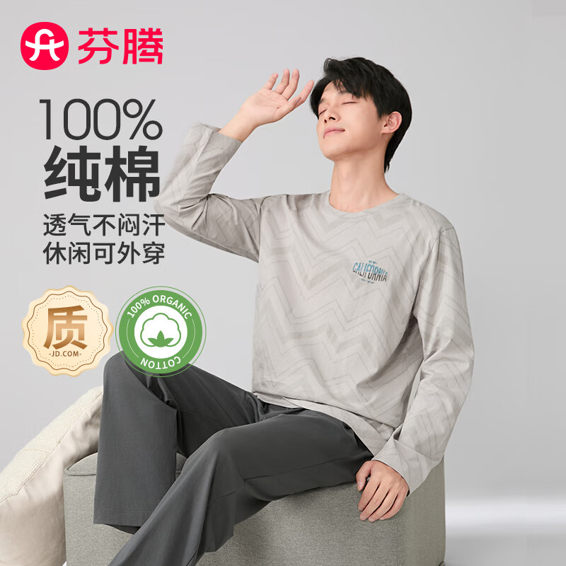 芬腾睡衣男100%纯棉2025秋新款套头圆领波浪纹休闲外穿长袖家居服套装 浅灰 2XL
