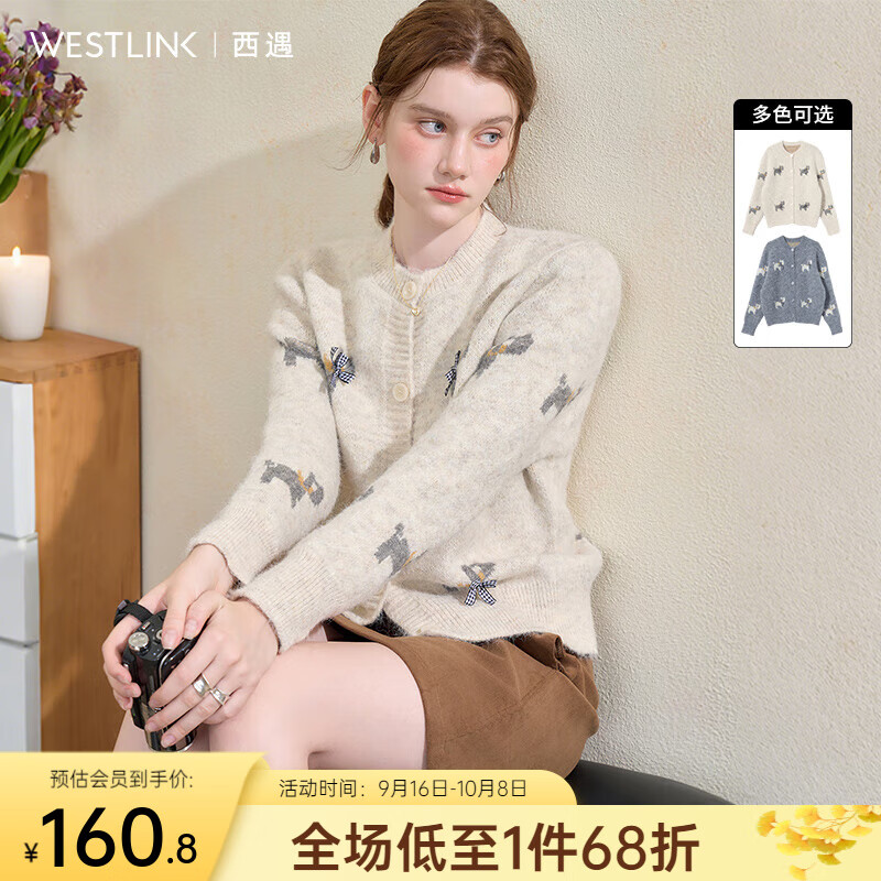 西遇(Westlink)韩系蝴蝶结小狗提花圆领针织衫女秋季新款百搭软糯毛衣 杏色 (M预售20天) M (160)