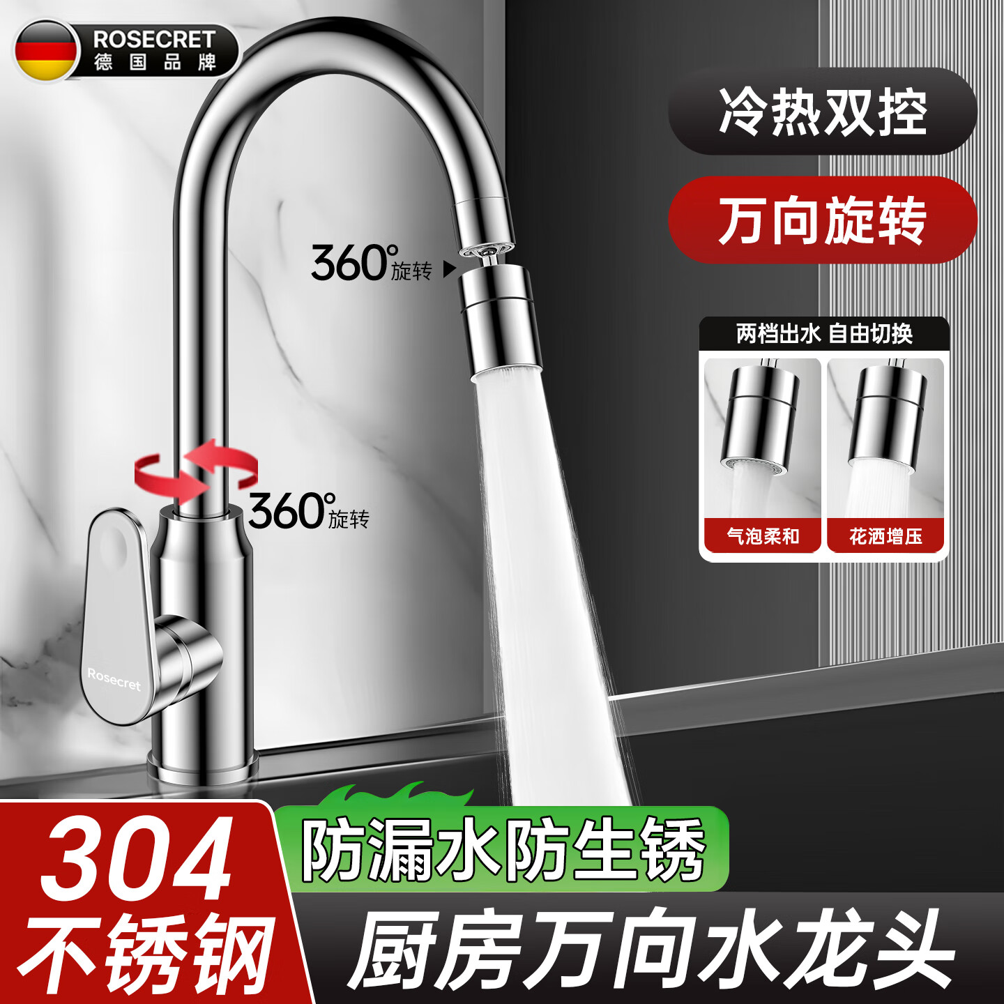 Rosecret【德国】304不锈钢厨房水龙头高抛冷热水器二合一万向洗菜盆龙头 两档增压厨房龙头【电镀银】 加厚加重主体丨送80cm冷热进水管*2