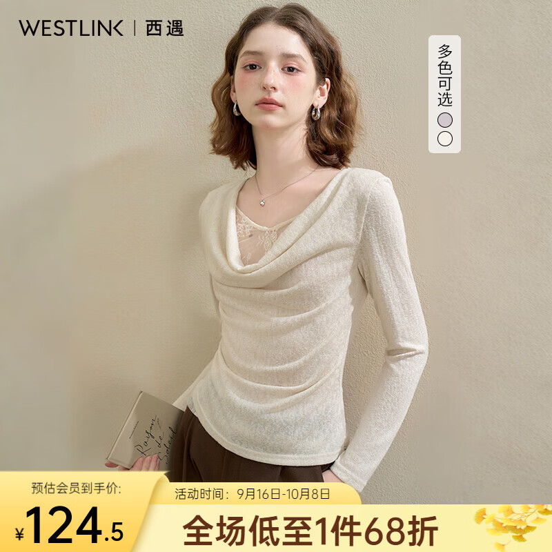 西遇温柔气质蕾丝拼接荡领长袖T恤女25秋季薄款假两件修身显瘦上衣 杏色 M (160)