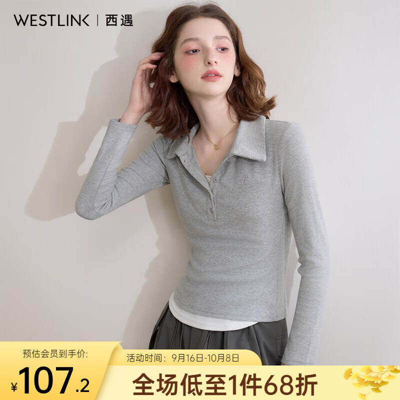 西遇 【层次感假两件】辣妹POLO领长袖T恤女2025春季修身上衣 灰色 M (160)