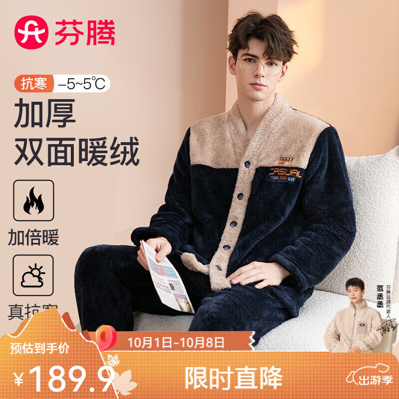 芬腾睡衣男【双面暖绒】秋冬季新款V领开衫保暖家居服套装 宝兰 2XL