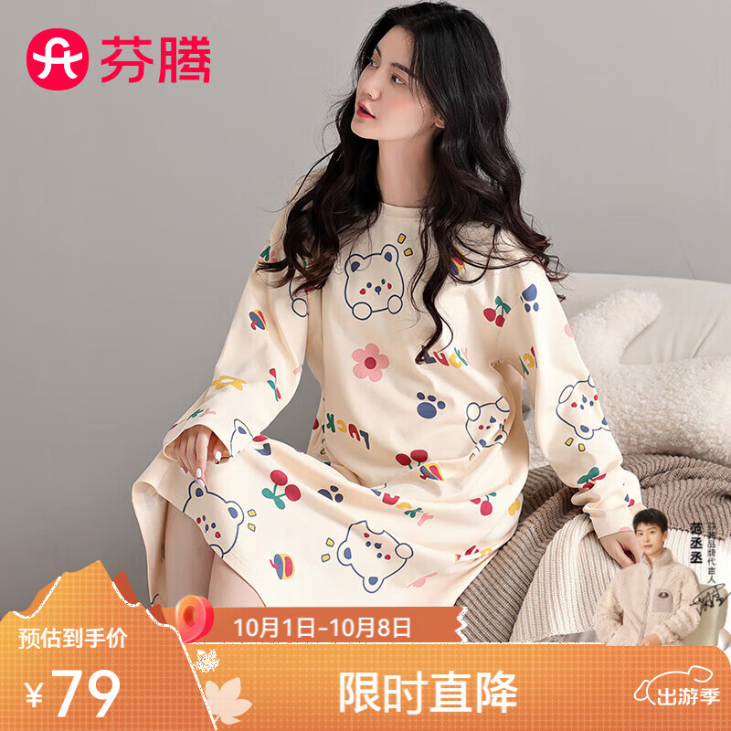 芬腾睡裙女2025秋新款纯棉亲肤圆领长袖卡通少女连衣裙长裙外穿 杏色 L