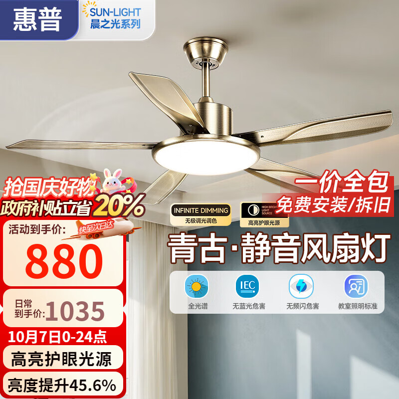 惠普风扇灯大尺寸风力家用一体铁艺客厅餐厅电扇灯吊扇灯2025新款 【合金扇叶】古铜色5叶/52寸无极
