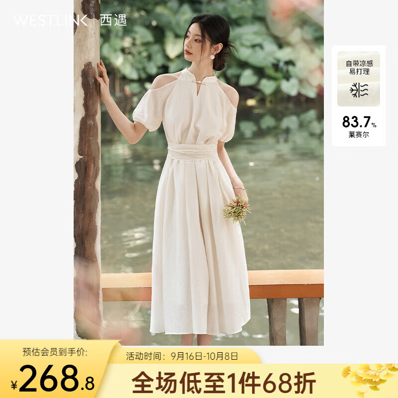 西遇挂脖连衣裙女2025夏季新款温柔水滴盘扣高腰新中式国风长裙 杏色 L