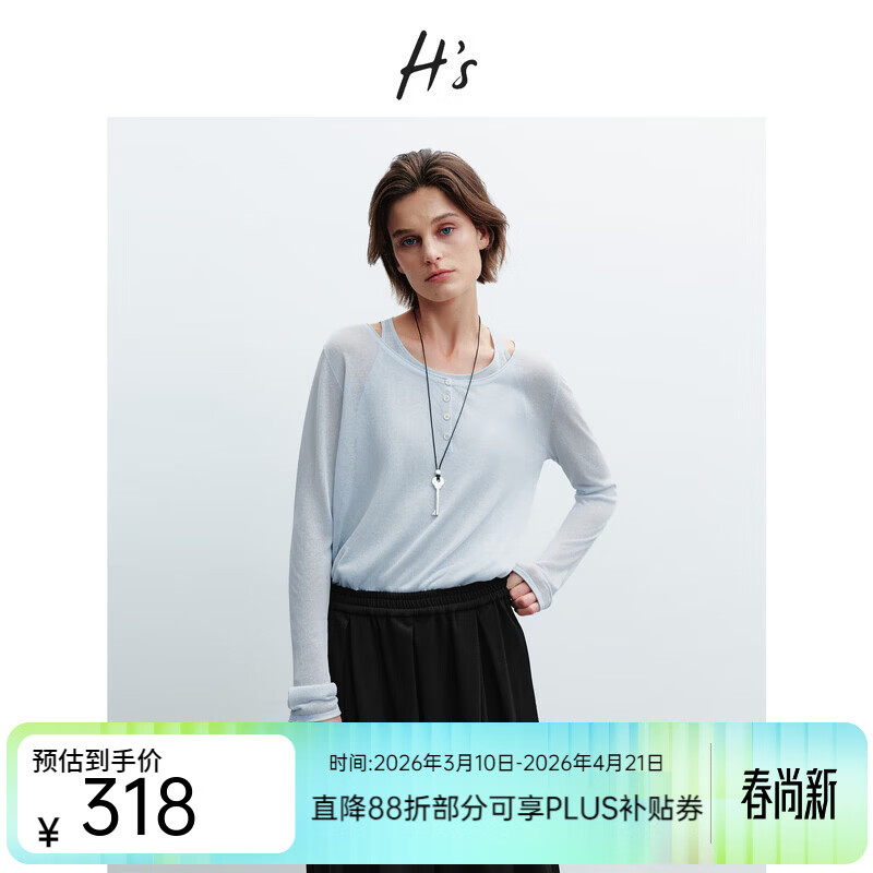 H's假两件针织衫女26年春季新款高级肌理感薄款微透落肩毛衣上衣 浅水蓝 S