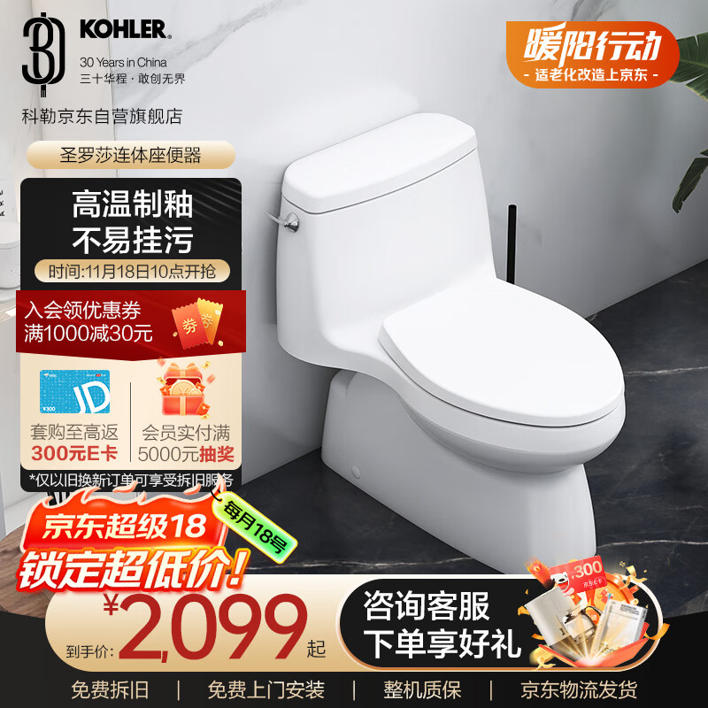 科勒(KOHLER)圣罗莎丽裙版家用马桶虹吸式坐便器抽水马桶五级旋风包安装 305mm