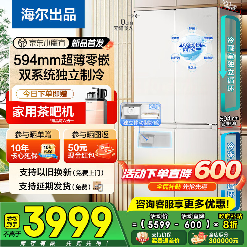 海尔(Haier)冰箱【25年新款】502升双系统超薄零嵌入式60cm内家用四开门十字门统帅懒人一级能效变频国家补贴 521全域除菌净化+阻氧干湿分储+594mm超薄