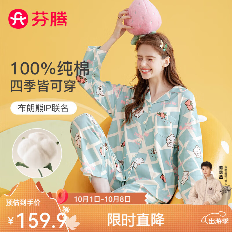 芬腾睡衣女纯棉新款联名可妮兔舒适长袖家居服睡衣套装 兰格 L