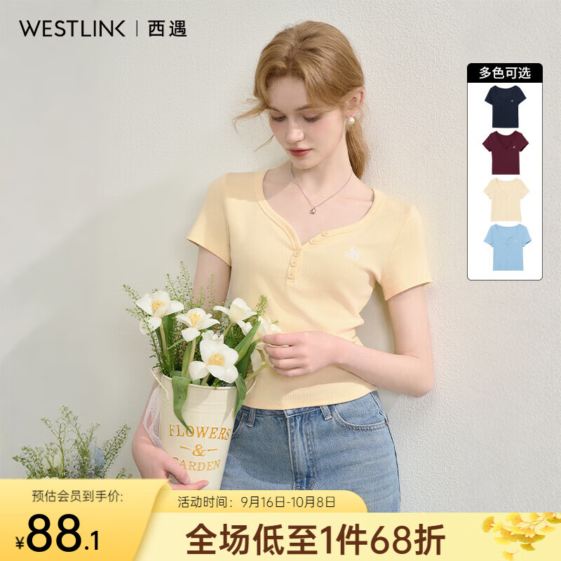 西遇复古刺绣正肩大领口短袖T恤2025夏弹力修身短款上衣 黄色 L (165)