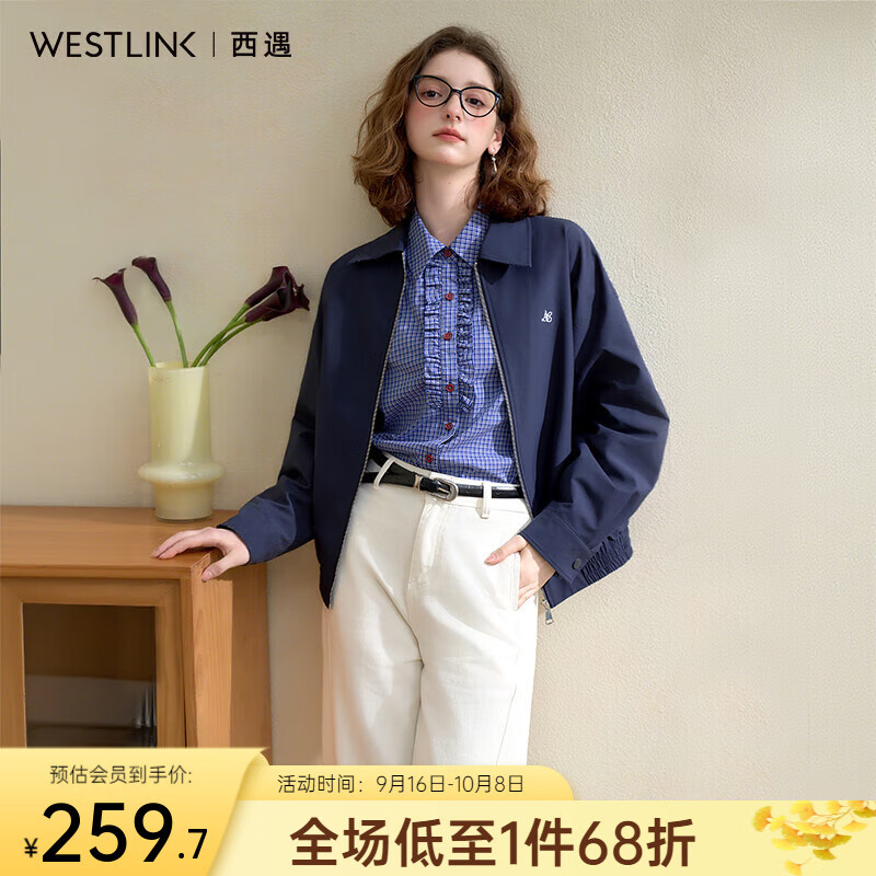 西遇(Westlink)西遇美式复古翻领夹克外套女秋新款百搭宽松休闲工装短上衣 宝蓝色 L (165)