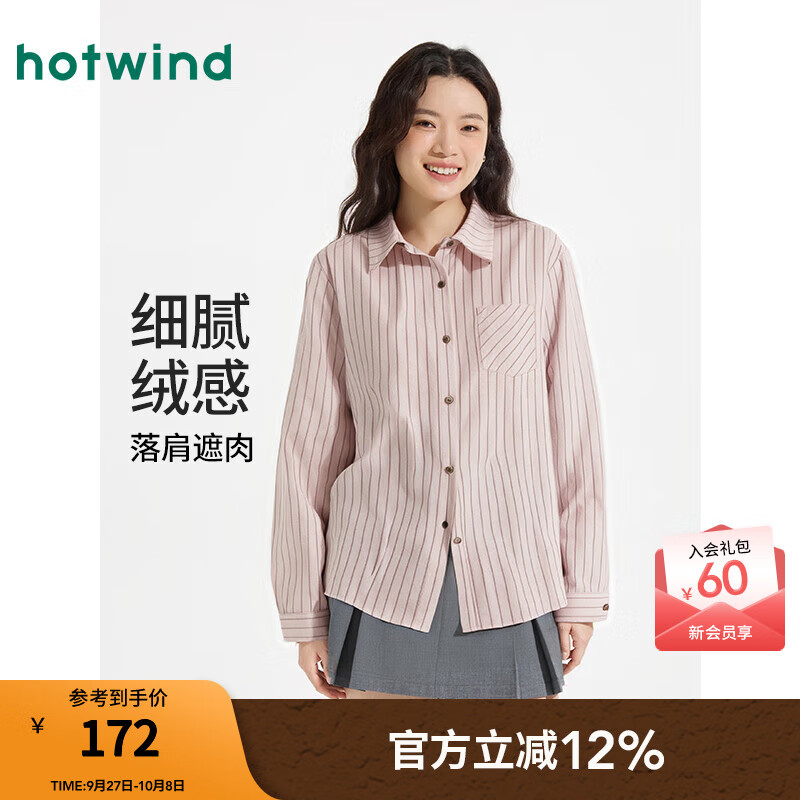 热风【商场同款】女士条纹长袖衬衫2025年秋季新款绒感宽松内搭薄外套 14粉红 S