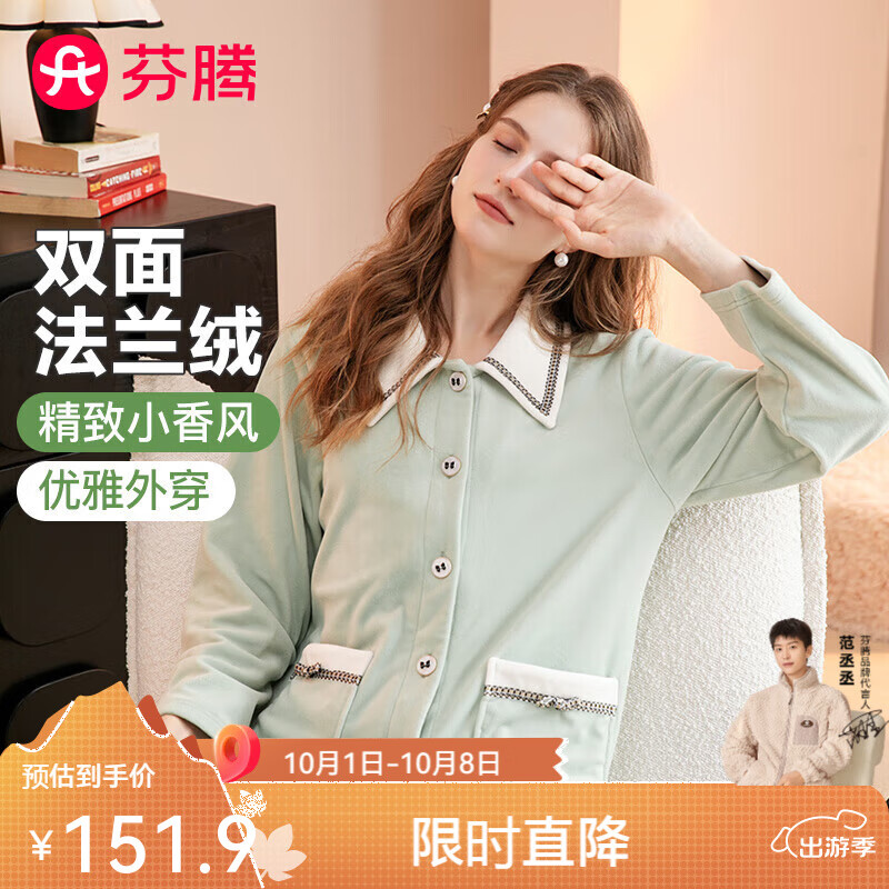 芬腾睡衣女【双面暖绒小香风】秋冬复古镶边翻领温暖家居服套装 薄荷绿 M