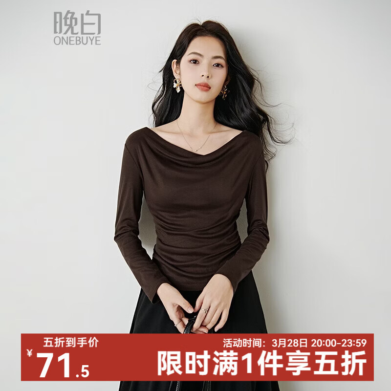 晚白2026年春款时尚优雅荡领miu系上衣亲肤柔软气质显瘦T恤衫女 深咖色 M