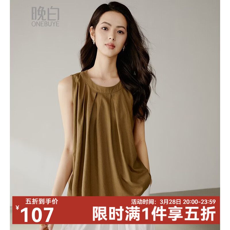 晚白【新品】2026年春款时尚纯色圆领棉麻上衣亲肤宽松无袖衬衫女 咖色 S