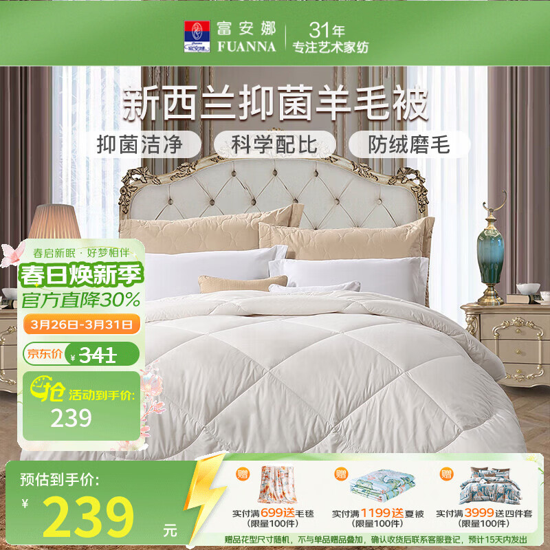 富安娜(FUANNA)新西兰羊毛被芯1.5米床冬季加厚双人抗菌保暖3-4斤被子203*229cm 冬被抗菌款【51%新西兰羊毛】暖梦 1.5米床(203*229cm)