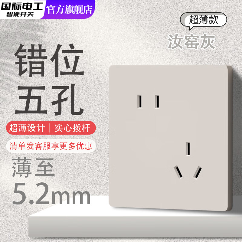 国际电工86型汝窑灰超薄拨杆开关插座面板奶油风暗装错位五孔一开双控面板 错位五孔