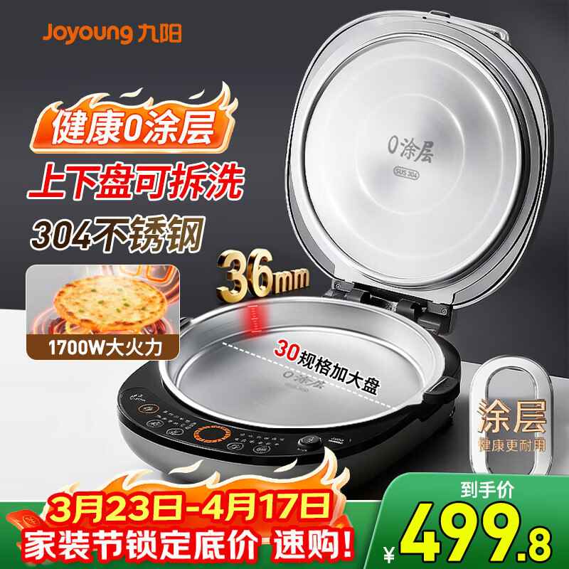 九阳(Joyoung)新品小钢人不锈钢电饼铛家用0涂层36MM悬浮盘可调火1700W双面加热电饼档烙饼锅早餐机JK30-GK750