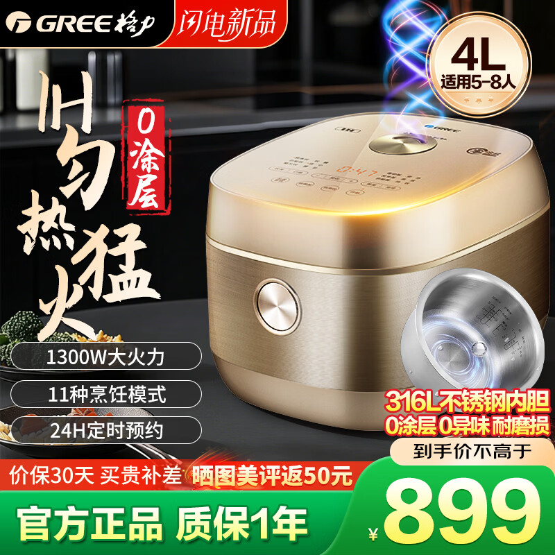 格力【2026年新款】电饭煲 4升0涂层 无异味316L不锈钢 IH加热多功能24小时定时预约1-8人无涂层电饭锅 【高端款】 4L 金属拉丝玻璃面板