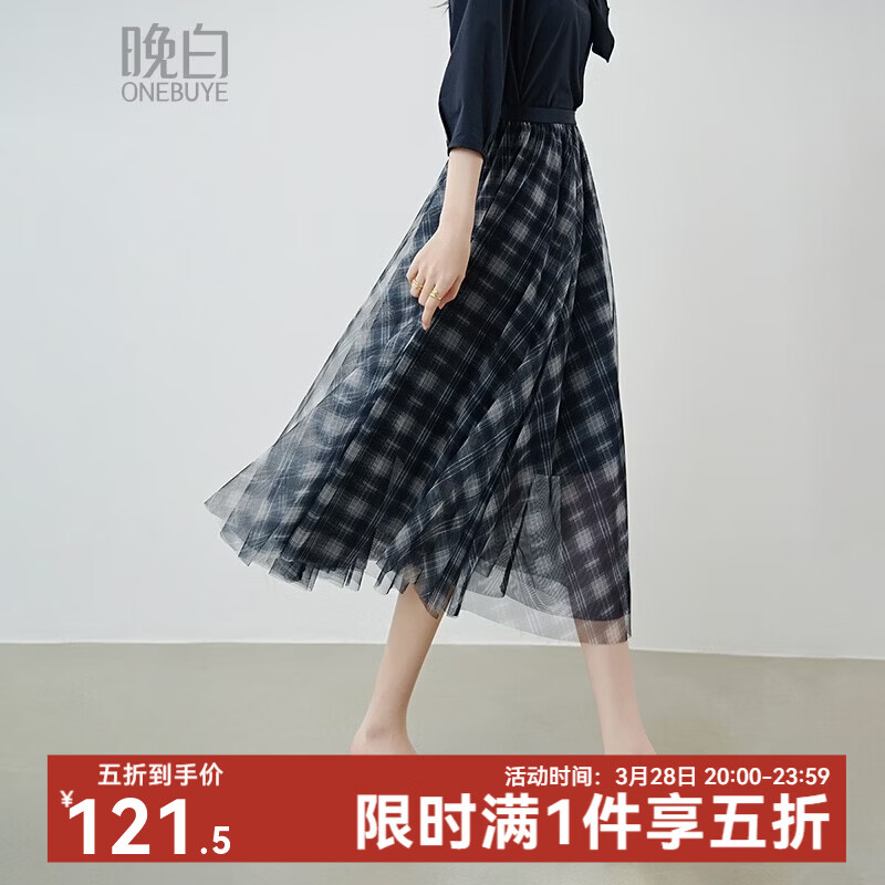 晚白2026年春款经典复古格纹松紧腰半裙气质减龄层次感纱裙大摆半身裙 深蓝色 XL