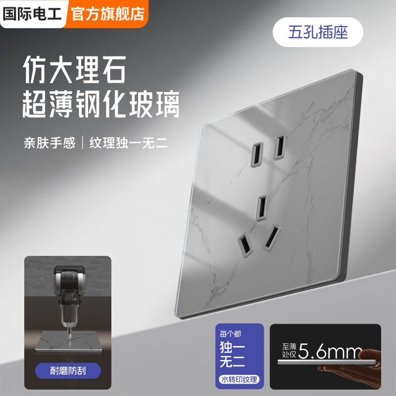 国际电工86型暗装超薄5.6mm钢化玻璃开关水转印纹理面板亲肤灰色五孔插座 五孔插座-肤感灰