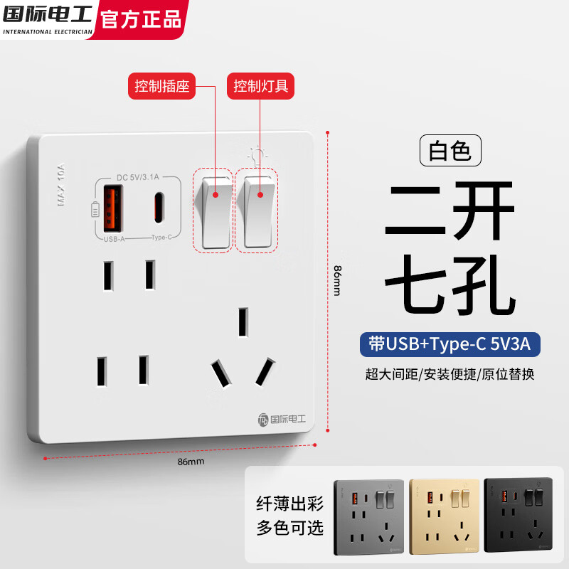 国际电工86型暗装二开七孔带USB-Typec开关插座手机充电墙壁电源面板7孔插 二开七孔USB+Type-c【白色】