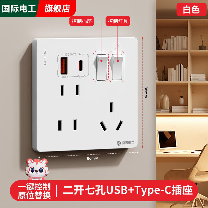 国际电工86型暗装二开七孔带开关插座面板家用床头墙壁USB+Type-c手机快充 【白色】二开七孔USB+Type-c