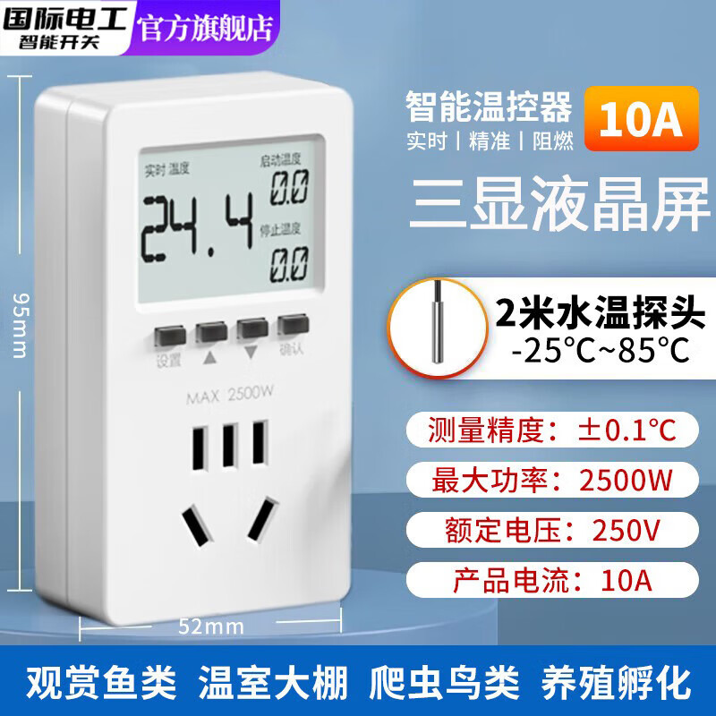 国际电工数显智能温控插座暖气锅炉控温开关鱼缸宠物可调温度控制器温控器 五孔10A温控器【实时数显/水温探头】