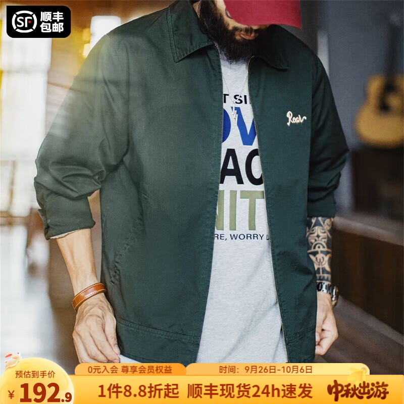 马登工装美式复古刺绣教练夹克男秋季新款翻领墨绿色纯棉重磅长袖外套 墨绿色 S