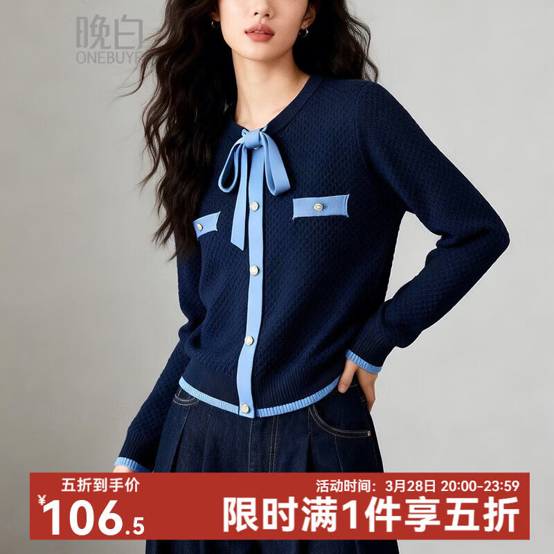晚白2026年春款时尚撞色圆领miu系毛衣亲肤舒适气质百搭小香针织衫女 深蓝色 L