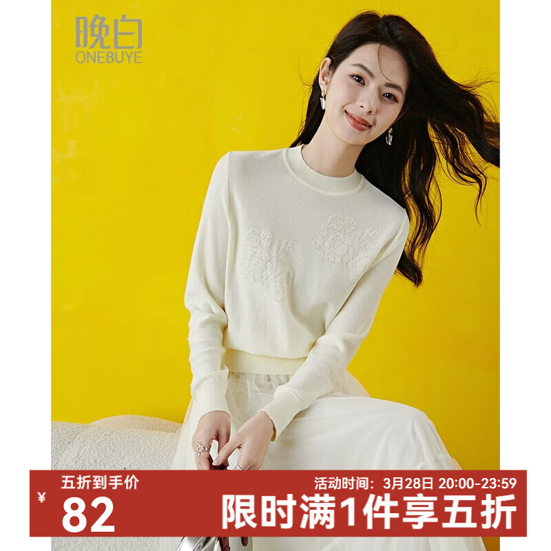 晚白【专享】2026年春款经典V领棉料上衣时尚镂空花纹舒适针织衫女 米白色 M