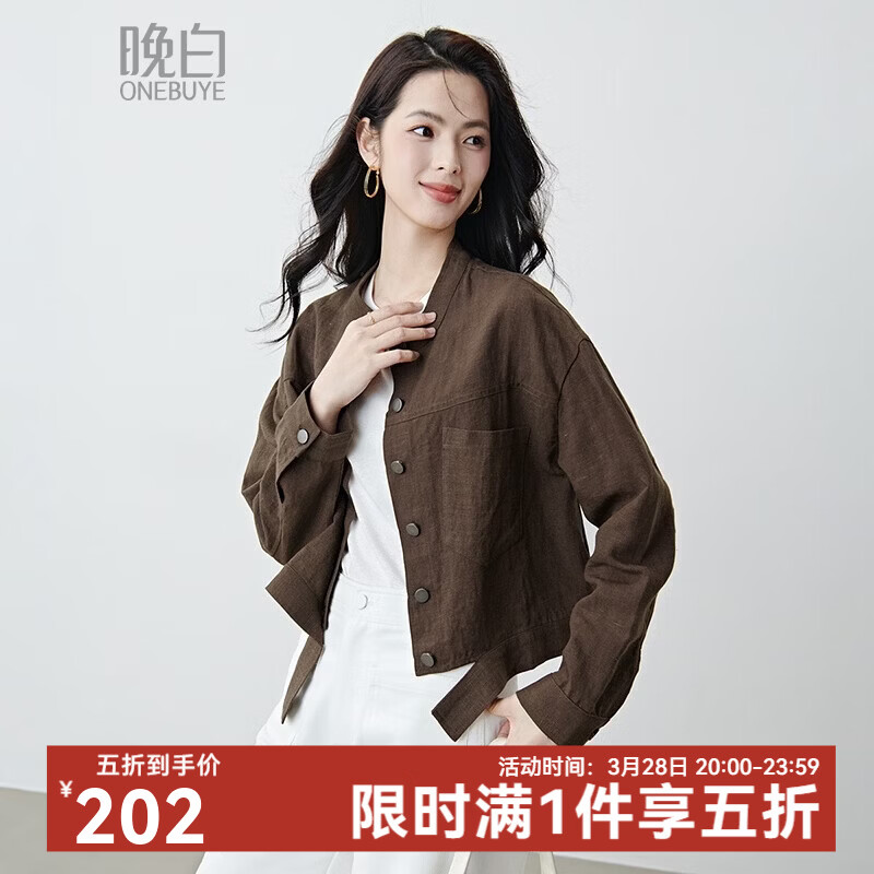 晚白【新品】2026年春款立领莱赛尔亚麻上衣时尚休闲大码短夹克外套女 棕色 M