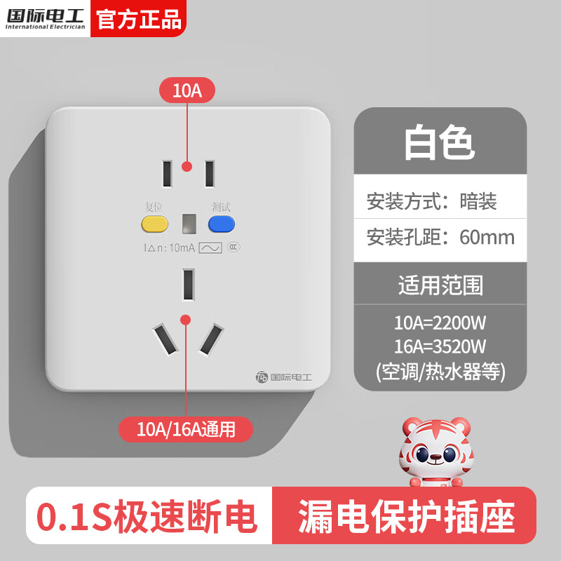 国际电工86型漏电保护器防触电热水器空调大功率专用五孔漏保插座 白色【10A/16A通用】五孔插座