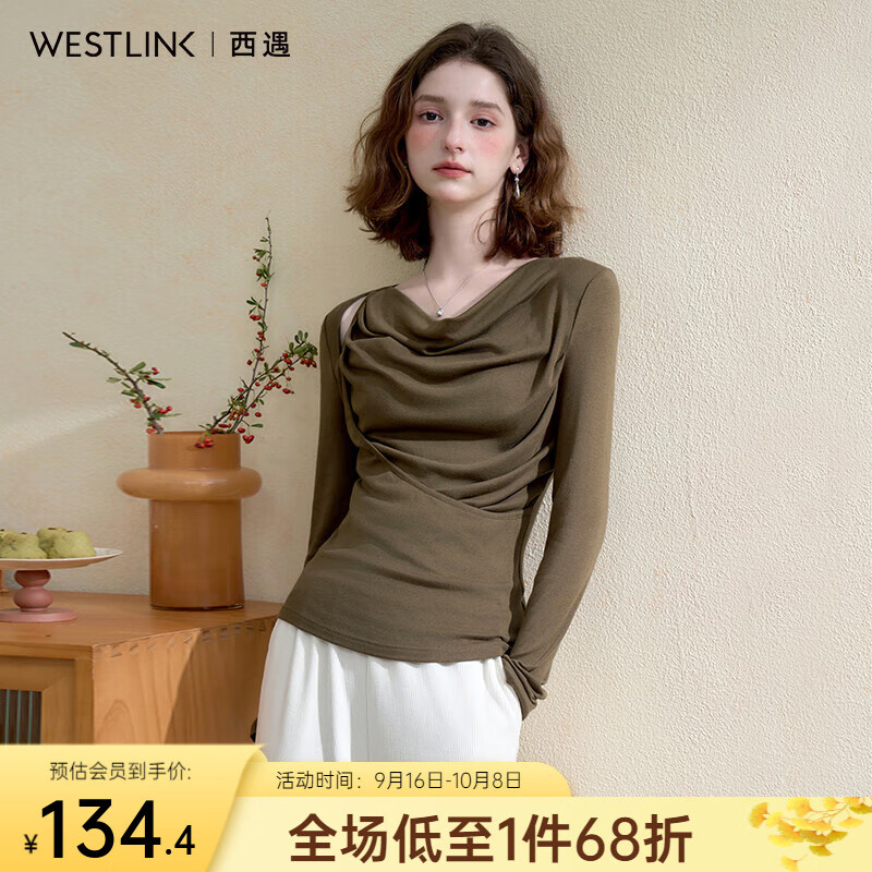 西遇气质荡领抽褶设计长袖针织T恤女2025秋季高级感修身显瘦上衣 绿色 (预售9月9日) L