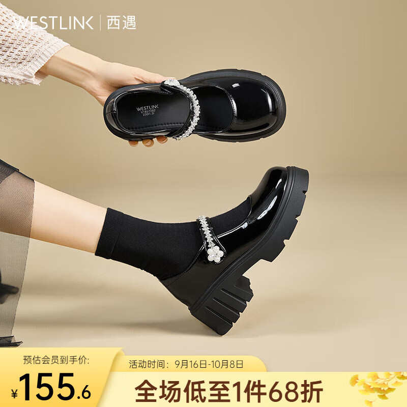 西遇(Westlink)玛丽珍小皮鞋女2025新款秋季亮面珍珠水钻增高厚底鞋黑色单鞋 黑色 35 (225)